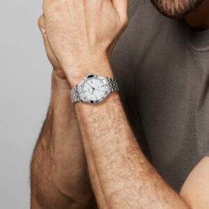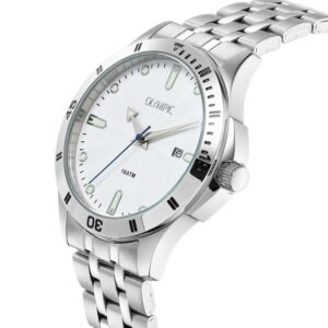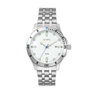 Dit unieke Olympic horloge met artikelnummer: OL72HSS407 is een herenhorloge met een classic sportieve uitstraling. Het horloge heeft een ronde stalen kast met een witte wijzerplaat met een datum, witte strepen en stippen ingelegd met lumibrite. Aan de kast zit een stalen schakelband met vouwsluiting. Het horloge heeft een mineraalglas, een doorsnee van 41mm en is 10ATM.