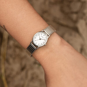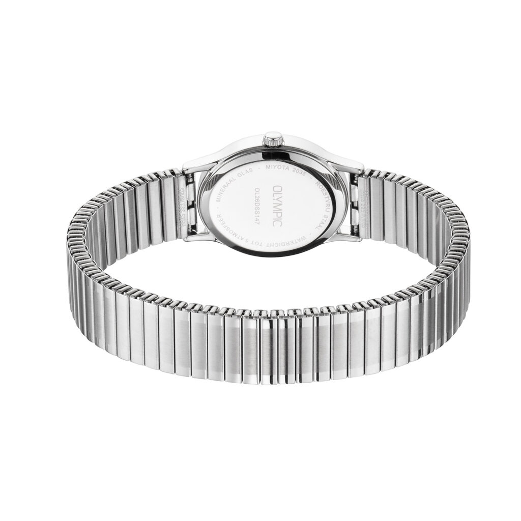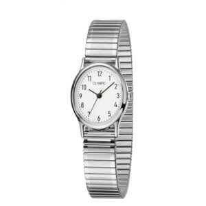 Dit unieke Olympic horloge met artikelnummer: OL26DSS147 is een dameshorloge met een classic uitstraling. De stalen ovale kast heeft een gladde bezel en een witte wijzerplaat met Arabische cijfers. Dit geeft het horloge een chique uiterlijk. Aan de stalen kast zit een zilverkleurige stalen rekband. Deze is in te korten of te verlengen door en schakels uit te halen of in te zetten. Het horloge heeft een mineraalglas, een doorsnee van 27mm en is 3ATM.
