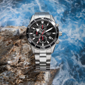Dit unieke Olympic horloge met artikelnummer: OL72HSS283 is een herenhorloge met chronograaf en heeft een sportieve uitstraling. De stalen kast heeft een zwarte bewerkte bezel en een zwarte wijzerplaat met een datum en chronograaf. De uursaanduiding is opvallend door de lumibrite strepen en wijzers. De rode accenten geven het horloge een sportief uiterlijk. Aan de stalen kast zit een stalen schakelband met een vouwsluiting. Het horloge heeft een mineraalglas, een doorsnee van 44mm en is 10ATM.
