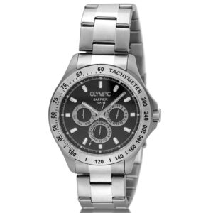 Dit unieke Olympic horloge met artikelnummer: OL89HSS049 is een sportief luxe herenhorloge. De stalen kast heeft een zilverkleurige bezel met een tachymeter en een zwarte wijzerplaat. Op de wijzerplaat zit de dag,- datum,- en 24-uursaanduiding met opvallende zilverkleurige accenten. Dit geeft het horloge een stoer uiterlijk. Aan de zilverkleurige kast zit een zilverkleurige schakelband met een vouwsluiting. Het horloge heeft een mineraalglas, een doorsnede van 42mm en is 10ATM.