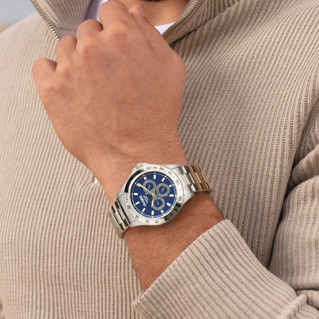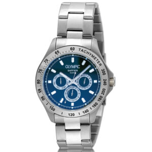 Dit unieke Olympic horloge met artikelnummer: OL89HSS050 is een sportief luxe herenhorloge. De stalen kast heeft een zilverkleurige bezel met een tachymeter en een blauwe wijzerplaat. Op de wijzerplaat zit de dag,- datum,- en 24-uursaanduiding met opvallende zilverkleurige accenten. Dit geeft het horloge een stoer uiterlijk. Aan de zilverkleurige kast zit een zilverkleurige schakelband met een vouwsluiting. Het horloge heeft een mineraalglas, een doorsnede van 42mm en is 10ATM.