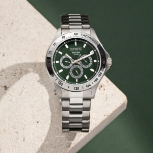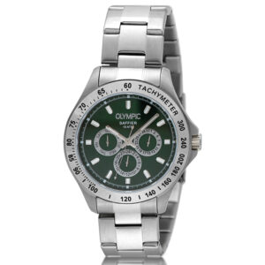 Dit unieke Olympic horloge met artikelnummer: OL89HSS051 is een sportief luxe herenhorloge. De stalen kast heeft een zilverkleurige bezel met een tachymeter en een groene wijzerplaat. Op de wijzerplaat zit de dag,- datum,- en 24-uursaanduiding met opvallende zilverkleurige accenten. Dit geeft het horloge een stoer uiterlijk. Aan de zilverkleurige kast zit een zilverkleurige schakelband met een vouwsluiting. Het horloge heeft een mineraalglas, een doorsnede van 42mm en is 10ATM.