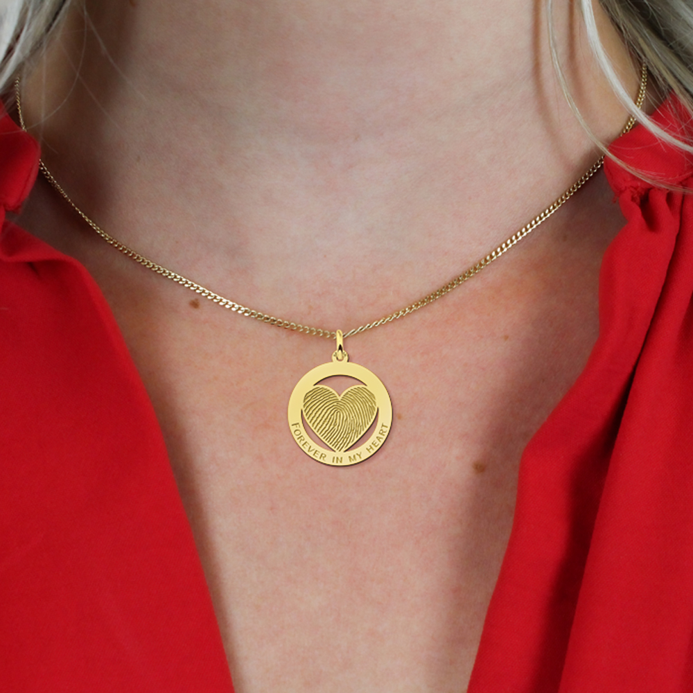 Deze omcirkelde hartvormige hanger met vingerafdruk is gemaakt van 14 karaats goud, de allerbeste kwaliteit goud, met een fijntjes gepolijst oppervlak dat mooi glanst. Deze hanger bestaat uit een slank oogje waar u gemakkelijk een ketting naar keuze doorheen haalt, met daaronder een hartvormig plaatje met daarop ruimte voor een te graveren vingerafdruk, met daaromheen een opengewerkte cirkel met onderin ruimte voor een korte te graveren tekst. Zo bent u verzekerd van een persoonlijk en uniek sieraad. Deze hanger heeft een diameter van 22,5mm met een dikte van 0,7mm.