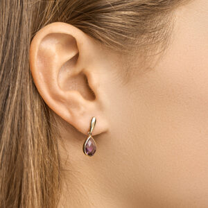 Geelgouden oorhangers met amethist. De oorhangers zijn onderdeel van een set.