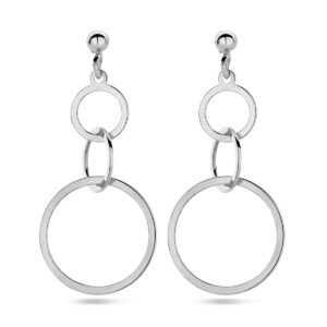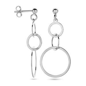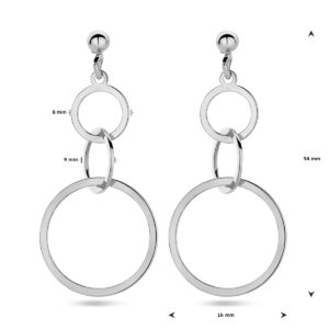 Deze fraaie Zilveren Oorhangers met Cirkels zijn vervaardigd uit 925 Sterling zilver, dat is voorzien van een Rhodium coating. Deze oorbellen zijn opgebouwd uit een bol oorknopje met daaronder in doorsnee verschillende, platte cirkels van respectievelijk 8, 9 en 16 mm, waardoor de totale lengte uitkomt op 34 mm. Het gewicht van deze oorstekers is circa 1,49 gram en ze worden gesloten met een zilveren vlindersluiting.