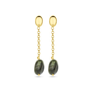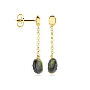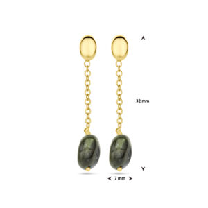 14k Geelgouden oorhangers uitgevoerd met groen toermalijn. De oorhangers hebben een totale hoogte van 31.5mm.