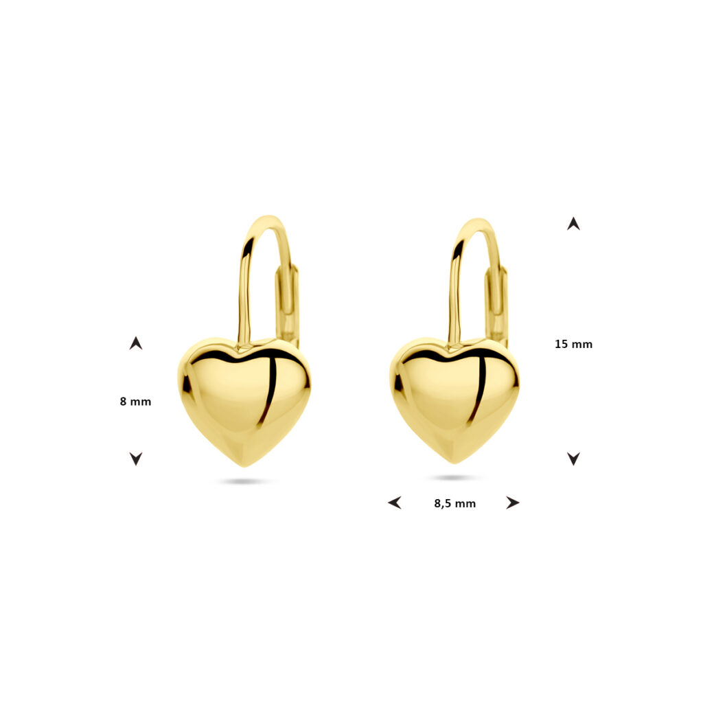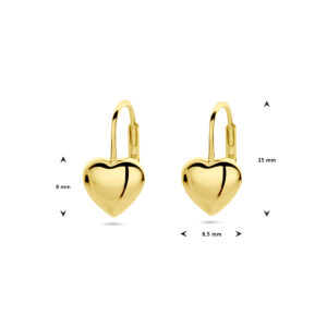 Geelgoud op 925 zilveren oorhangers. Het hart heeft een afmeting van 8×8.5mm.