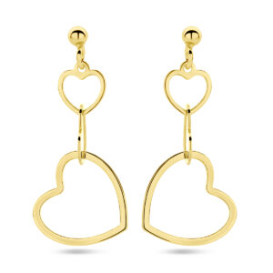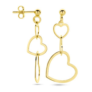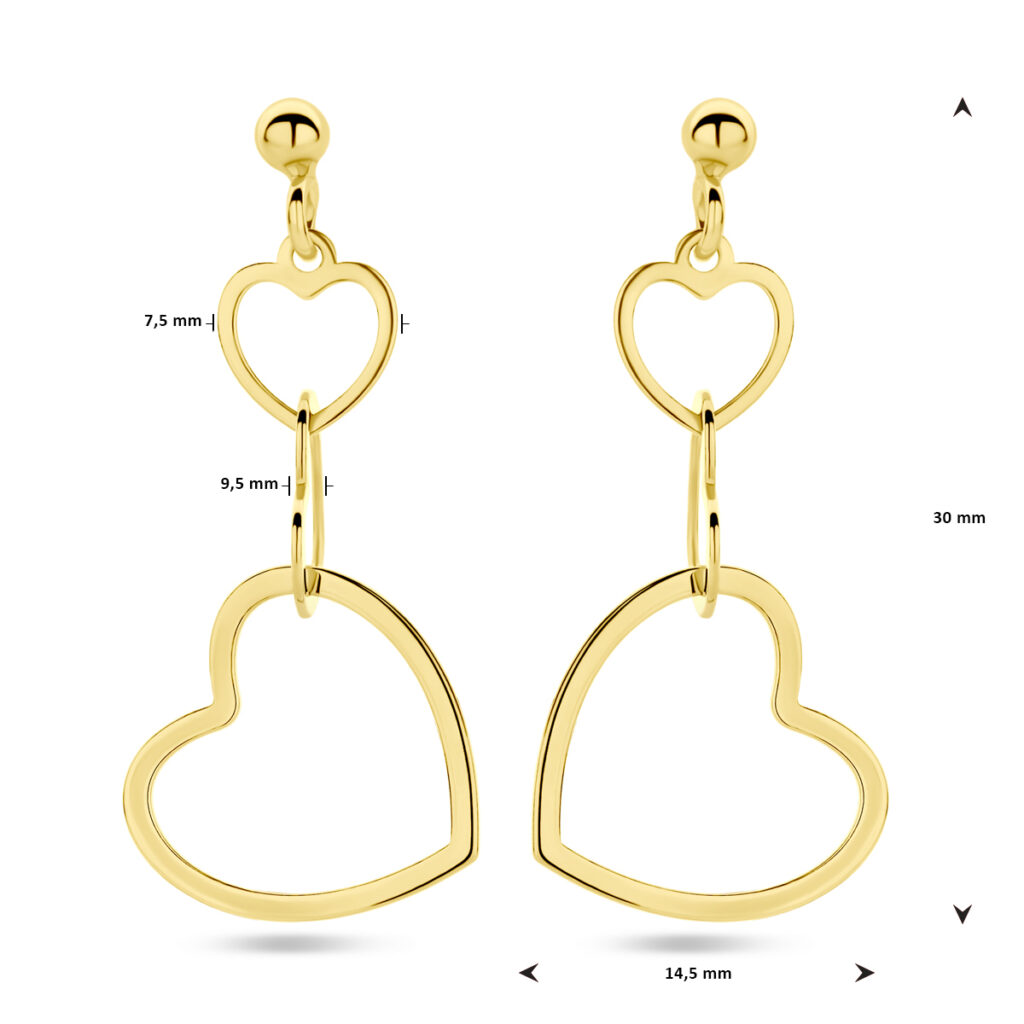 Geelgoud op 925 zilveren oorhangers uitgevoerd met twee hartjes. De oorhangers hebben een totale hoogte van 3cm en een breedte van 14.5mm.