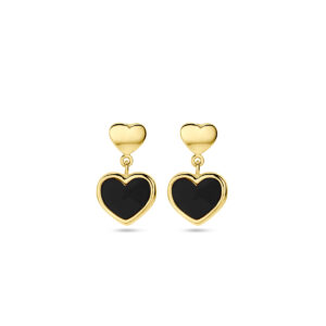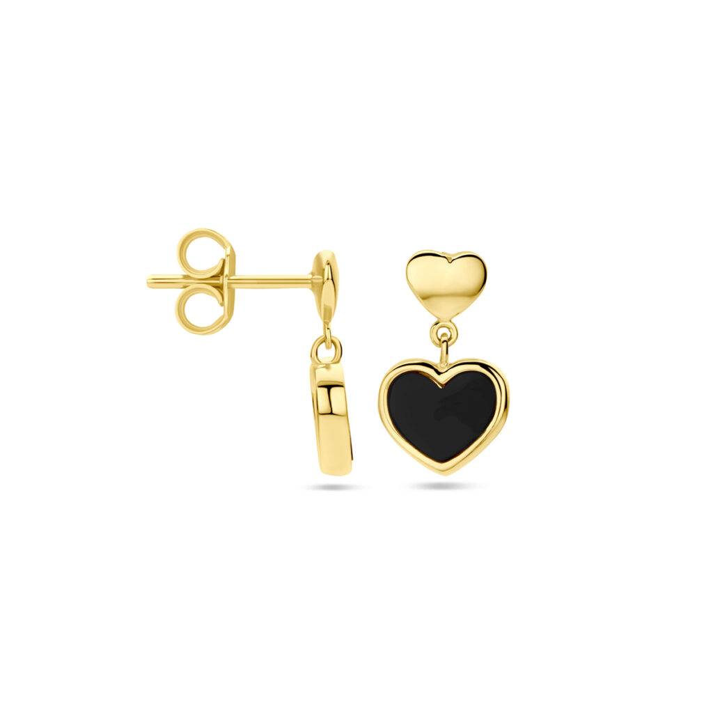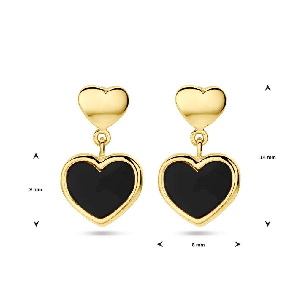 14k Geelgouden oorhangers uitgevoerd met hartjes en een onyx steen. De hartjes hebben afmetingen van 4x5mm en 7.5x8mm. De oorhangers hebben een totale hoogte van 14mm.