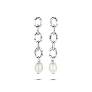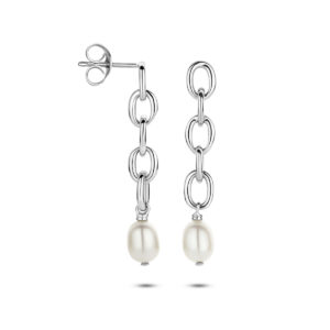 Gerhodineerd 925 zilveren oorhangers uitgevoerd met zoetwaterparel. De oorhangers hebben een totale hoogte van.