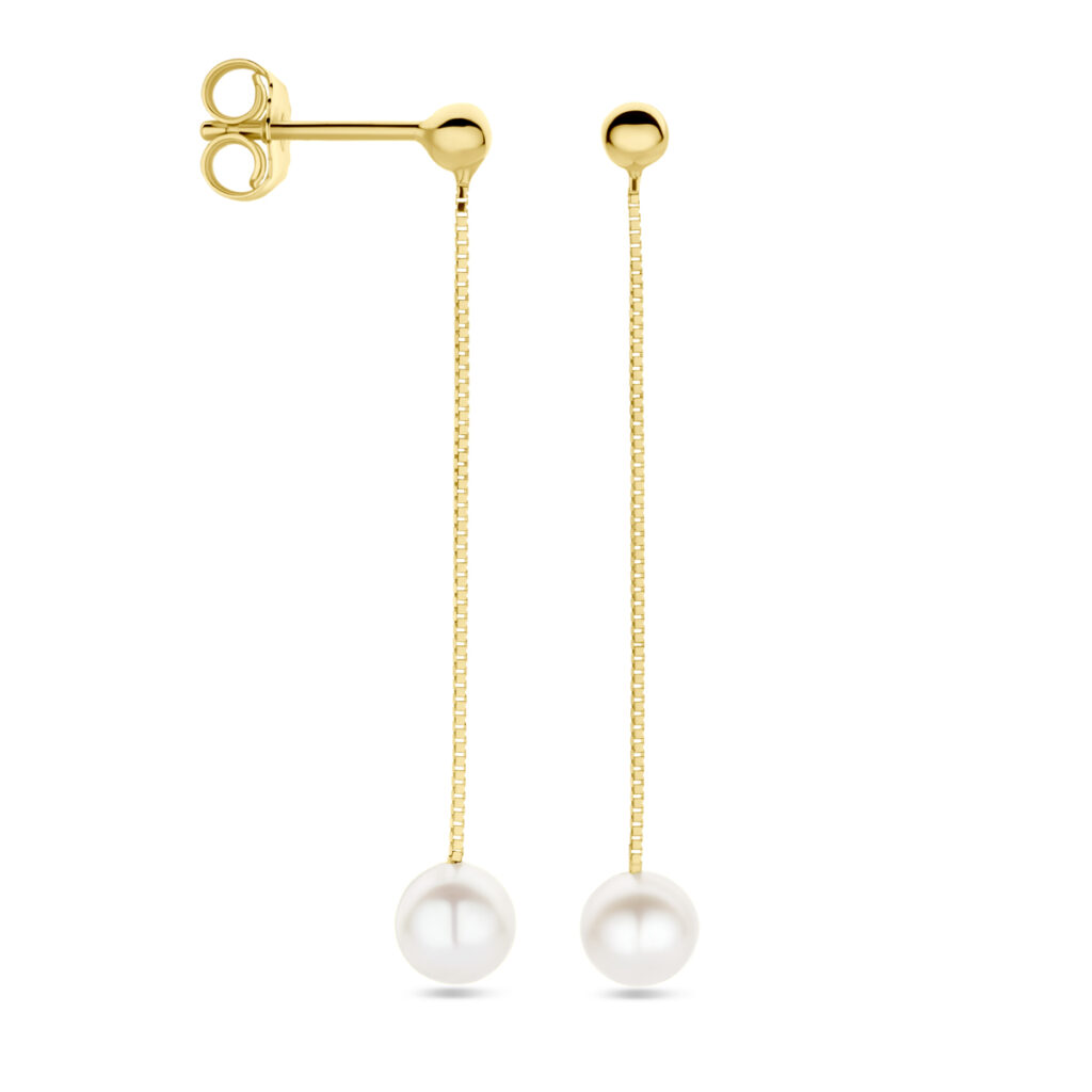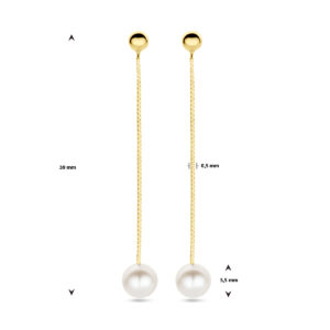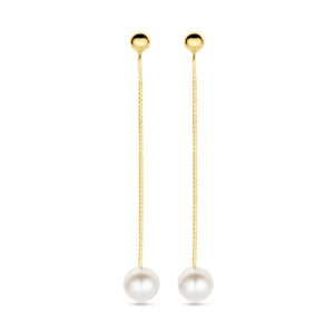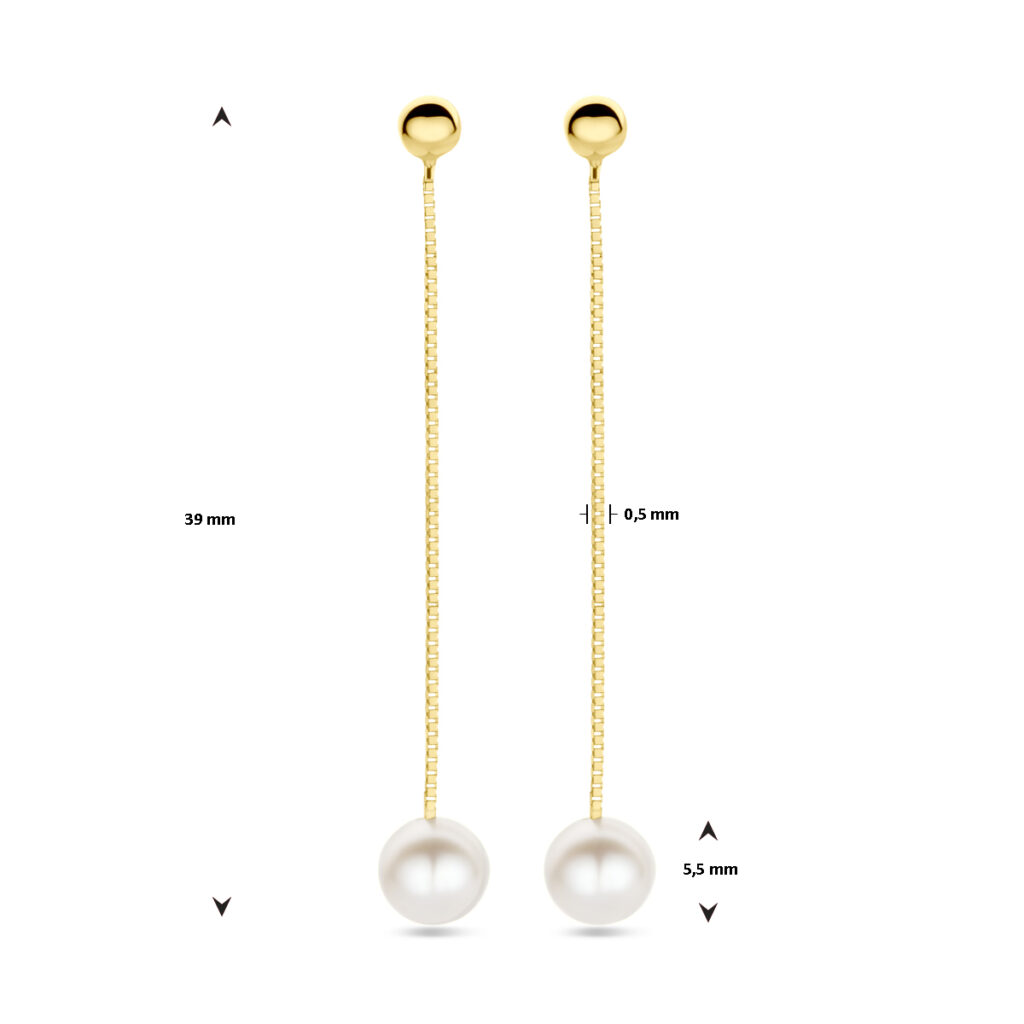 14k Geelgouden oorhangers uitgevoerd met zoetwaterparel. De oorhangers hebben een totale hoogte van 39mm.