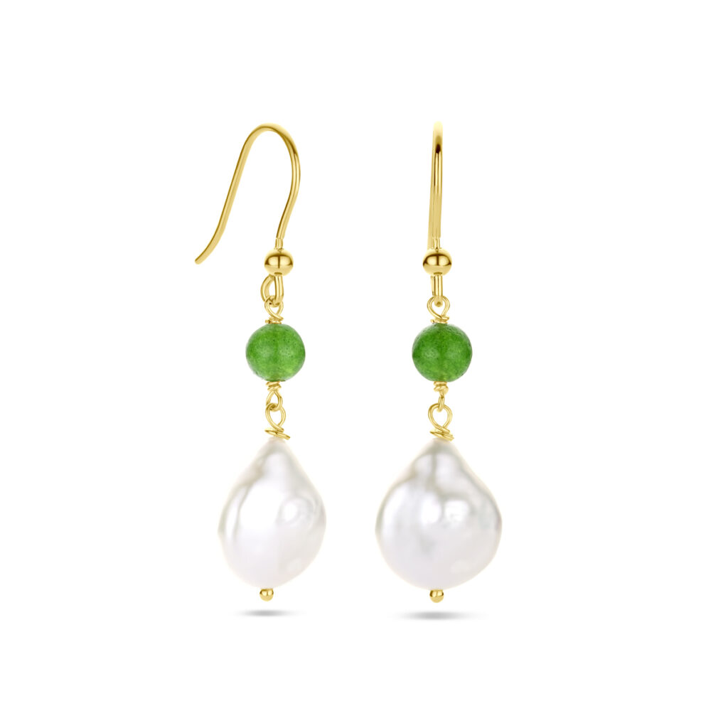 Geelgoud op 925 zilveren oorhangers uitgevoerd met zoetwaterparel en groen agaat. De oorhangers hebben een totale hoogte van 40mm. Geen garantie op de plating.