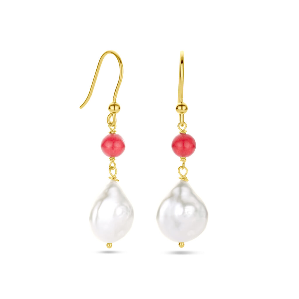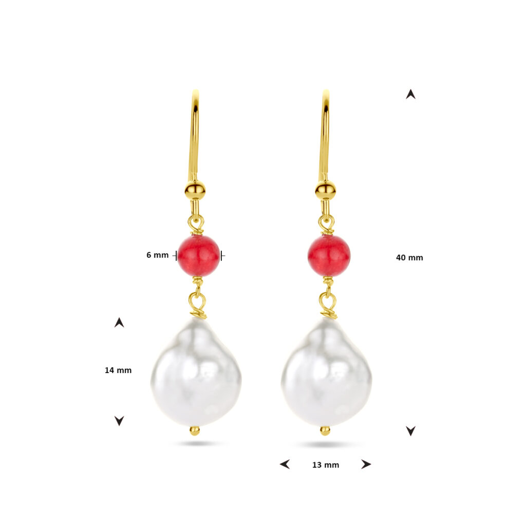 Geelgoud op 925 zilveren oorhangers uitgevoerd met zoetwaterparel en rood agaat. De oorhangers hebben een totale hoogte van 40mm. Geen garantie op de plating.