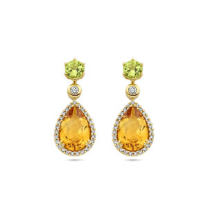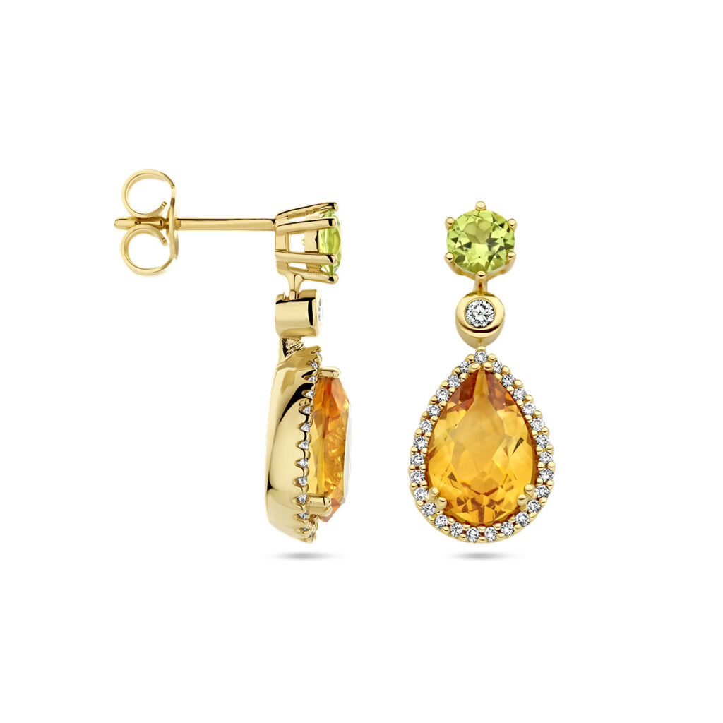 14k Geelgouden oorhangers uitgevoerd met peridot, citrien en diamanten. De oorhangers hebben een totale hoogte van 21mm.