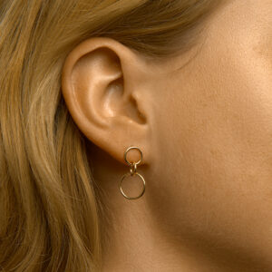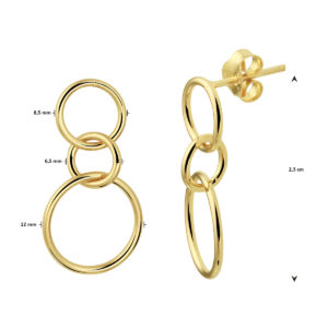 Geelgoud op 925 zilveren oorhangers uitgevoerd met rondjes. De oorhangers hebben een totale hoogte van 2.3cm en een breedte van 12mm.