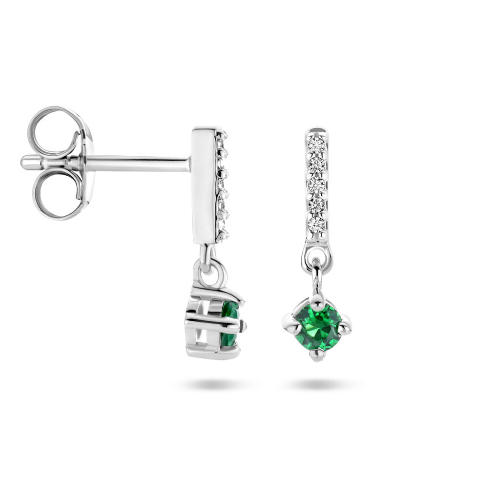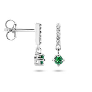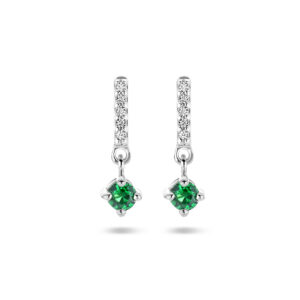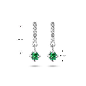 Deze stijlvolle Zilveren Zirkonia Oorhangers met Synthetische Smaragd zijn vervaardigd uit gepolijst 925 Sterling zilver, dat is voorzien van een gerhodineerde coating. De oorhangers hebben een metaalgewicht van circa 0,96 gram. Deze oorhangers bestaan uit een staafje dat aan de achterkant is voorzien van een oorsteker en aan de voorkant van een naar beneden hangend staafje, dat is voorzien van in rijzetting geplaatste, briljant geslepen, kleurloze Zirkonia stenen, met daar onderaan een hangertje met een chaton gezette, briljant geslepen, groene synthetische Smaragd met en steenmaat van 3 mm doorsnee. De oorhangers hebben een totale hoogte van 14 mm bij een breedte van 4,5 mm. Deze oorhangers worden gesloten met een vlindersluiting.