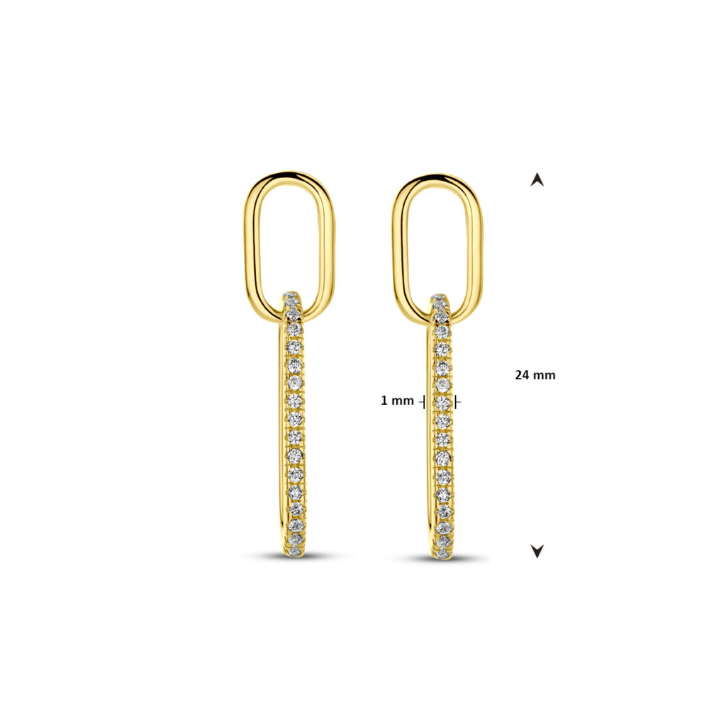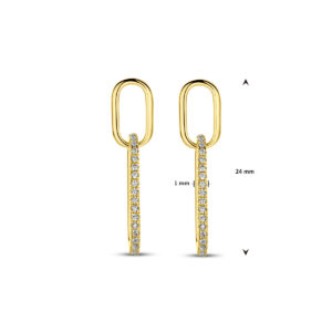 Geelgoud op 925 zilveren oorhangers uitgevoerd met zirkonia. De oorhangers hebben een totale hoogte van 24mm. Geen garantie op de plating.