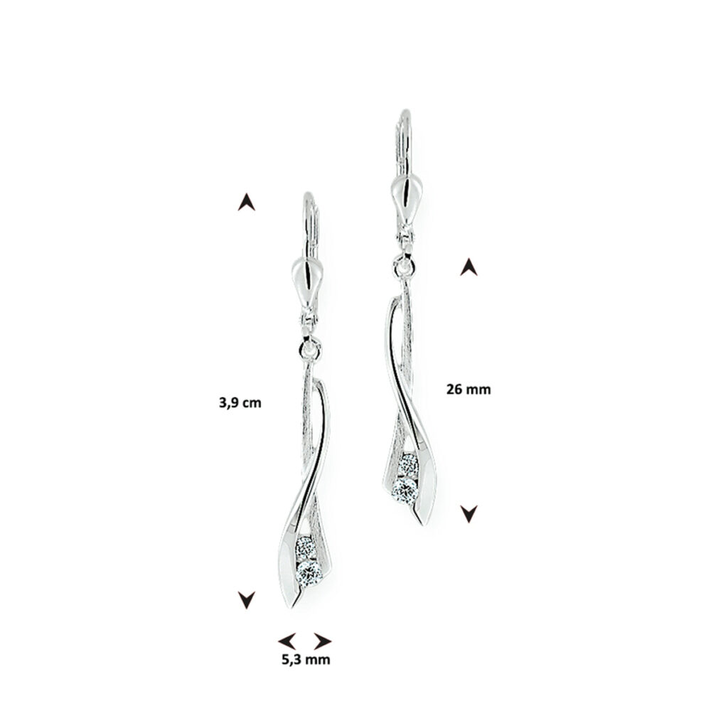 Deze Wokkel Oorhangers van Gepolijst en Mat Zilver met Zirkonia’s voor Dames zijn volledig gemaakt van 925 sterling zilver, de allerbeste kwaliteit zilver, en voorzien van een deels mat en deels gepolijst om elkaar draaiende gebogen staven met in het uiteinde twee in grootte verschillende, kleurloze zirkonia’s. Deze oorhangers bestaan uit een hanger van een deels gepolijst en deels mat oppervlak en twee ongekleurde zirkonia’s. Deze oorhangers zijn specifiek voor dames en hebben een elegante uitstraling. Door hun sierlijke uiterlijk zijn deze oorhangers bijzonder geschikt voor speciale gelegenheden. Deze oorhangers hebben een breedte van 5,5mm en een hoogte van 26mm.