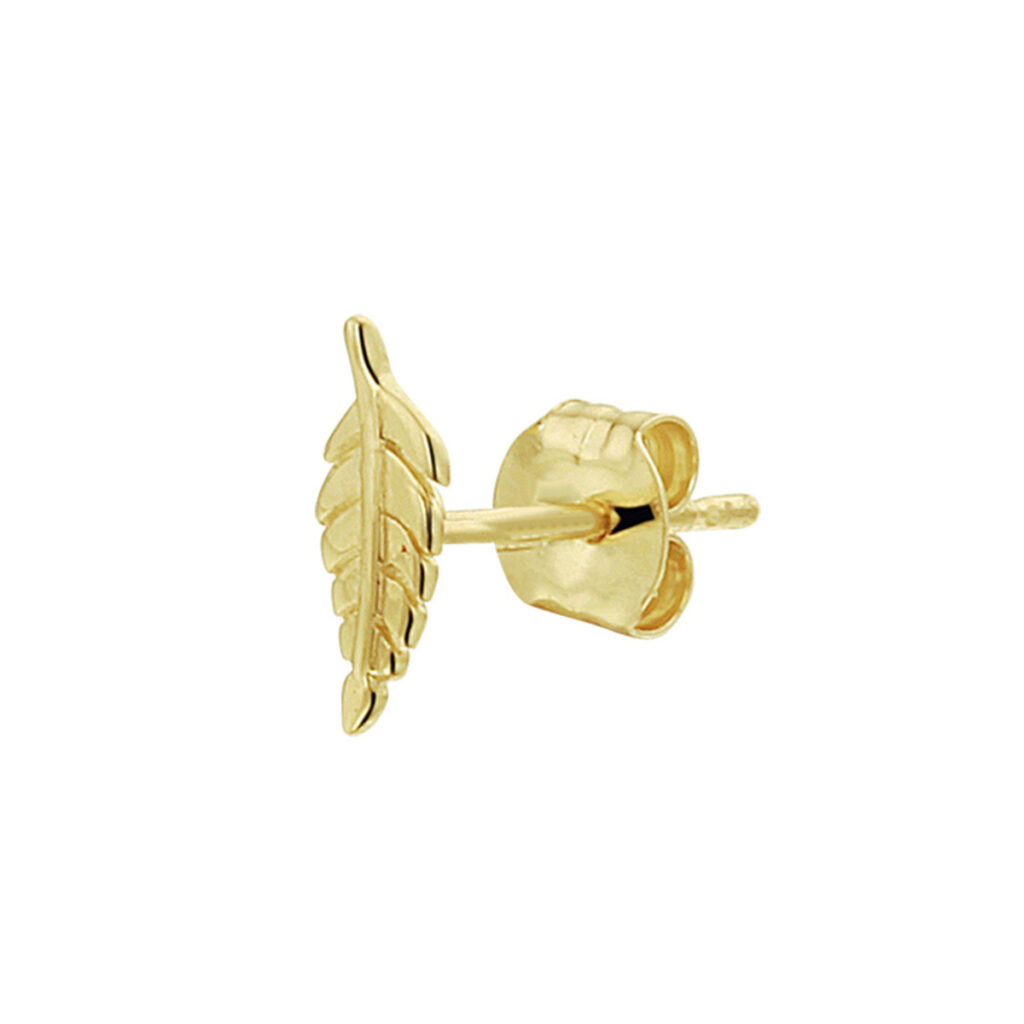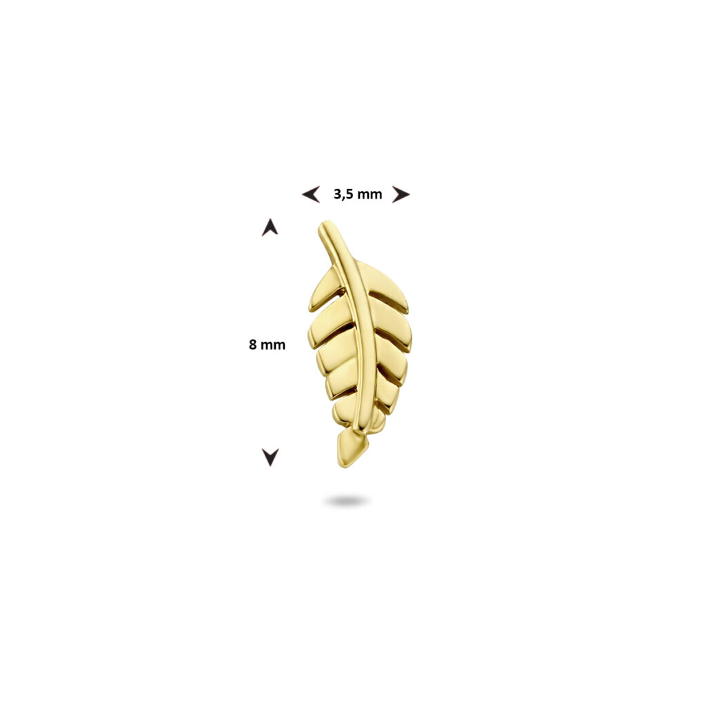 14k Geelgouden oorknop in de vorm van een veer met een afmeting van 8×3.5mm. Uitgevoerd met een stevige poussette sluiting. Deze oorsieraden worden per stuk verkocht ipv per paar.