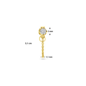14k Geelgouden oorknop uitgevoerd met wit zirkonia. De oorknop heeft een diameter van 3mm. Deze oorsieraden worden per stuk verkocht ipv per paar.
