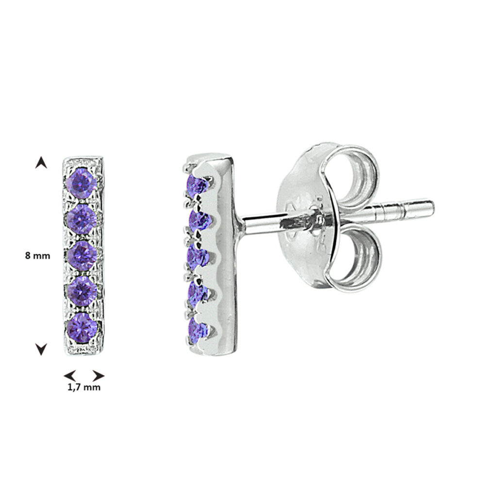 Gerhodineerd 925 zilveren oorknoppen in de vorm van een balkje uitgevoerd met paars zirkonia. De oorknoppen hebben een afmeting van 8×1.7mm.