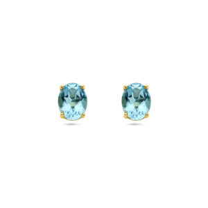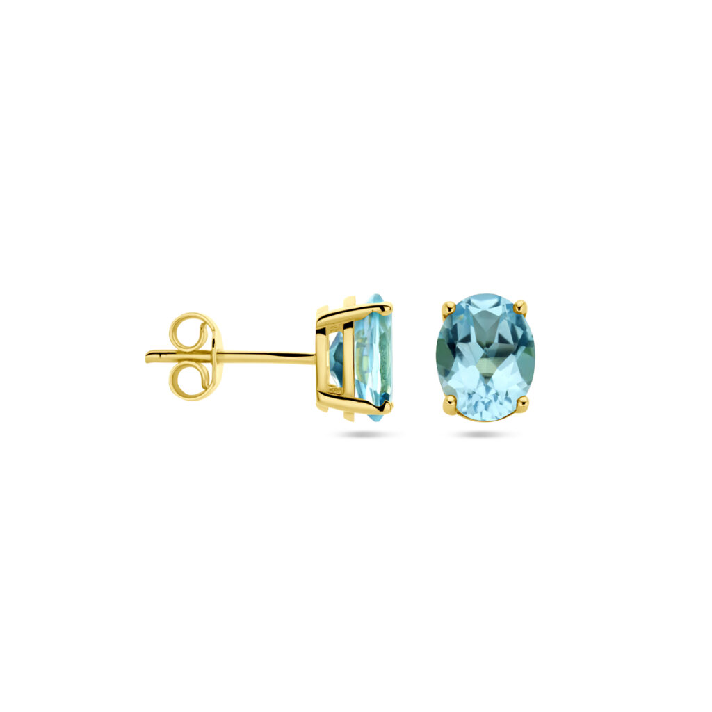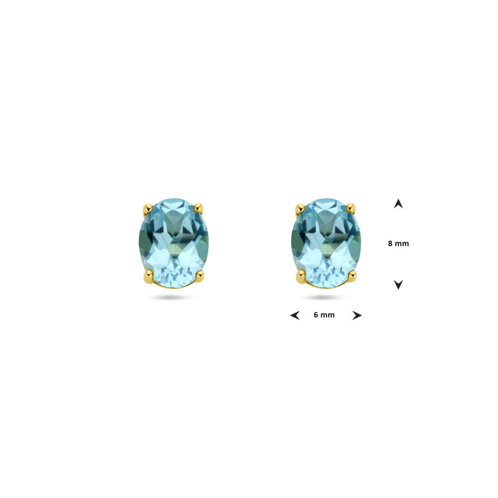 14k Geelgouden oorknoppen uitgevoerd met blauw topaas. De oorknoppen hebben een afmeting van 8x6mm.