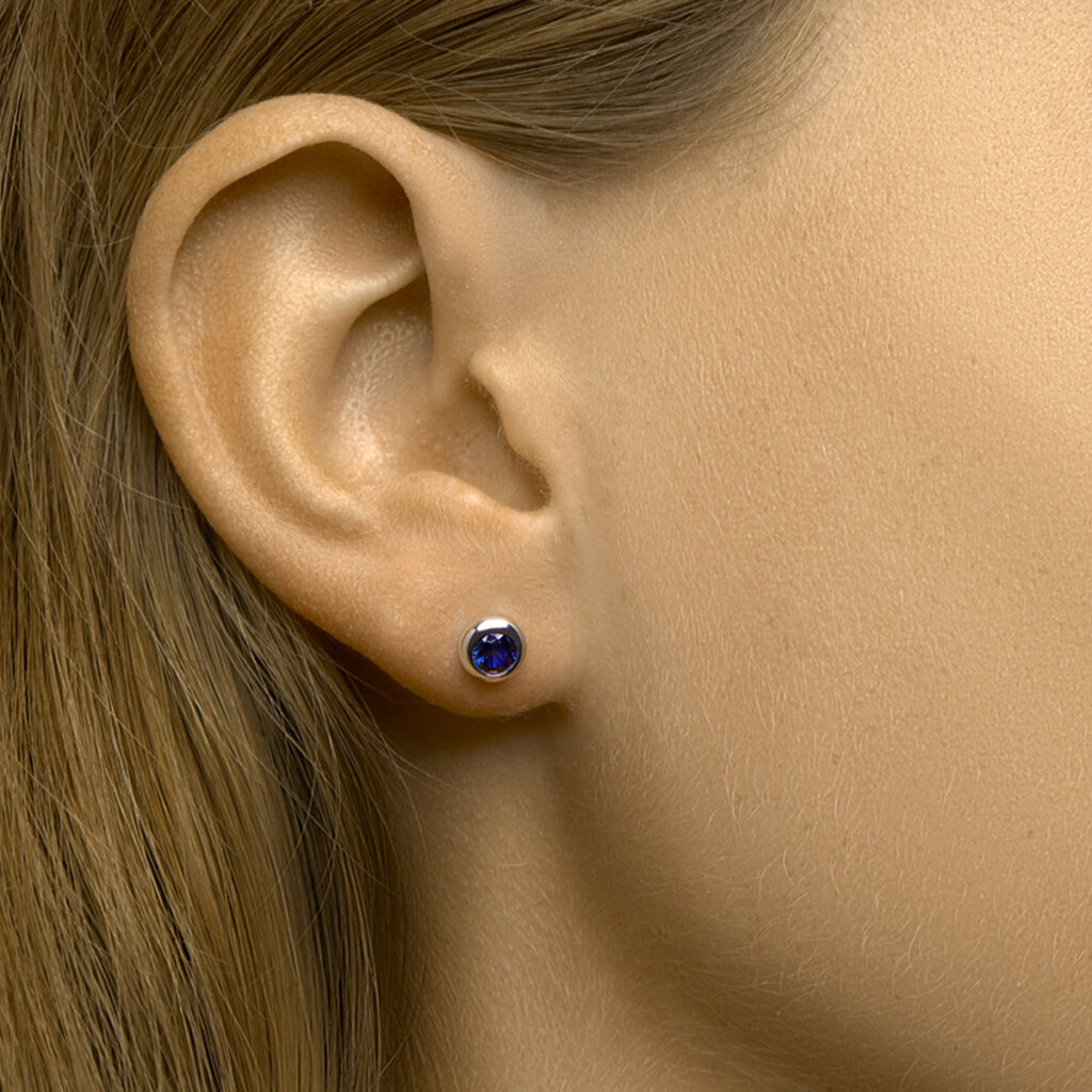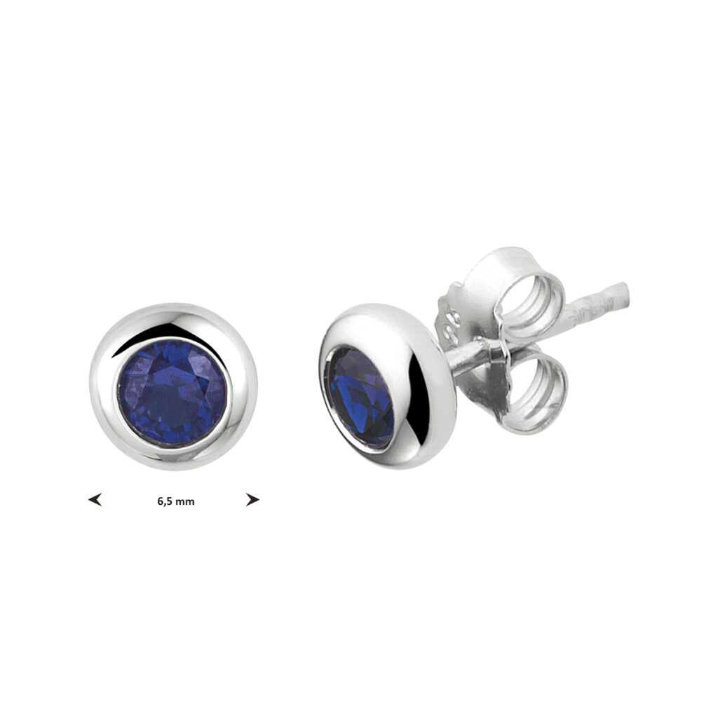 Gerhodineerd 925 zilveren oorknoppen uitgevoerd met blauw zirkonia. De oorknoppen hebben een diameter van 6.5mm.