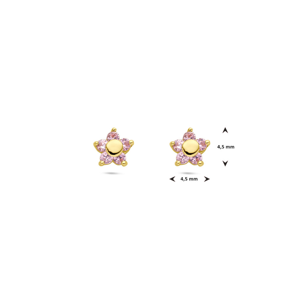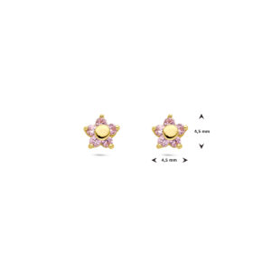 14k Geelgouden oorknoppen uitgevoerd in de vorm van een bloem met roze zirkonia. De oorknoppen hebben een afmeting van 4.5×4.5mm.