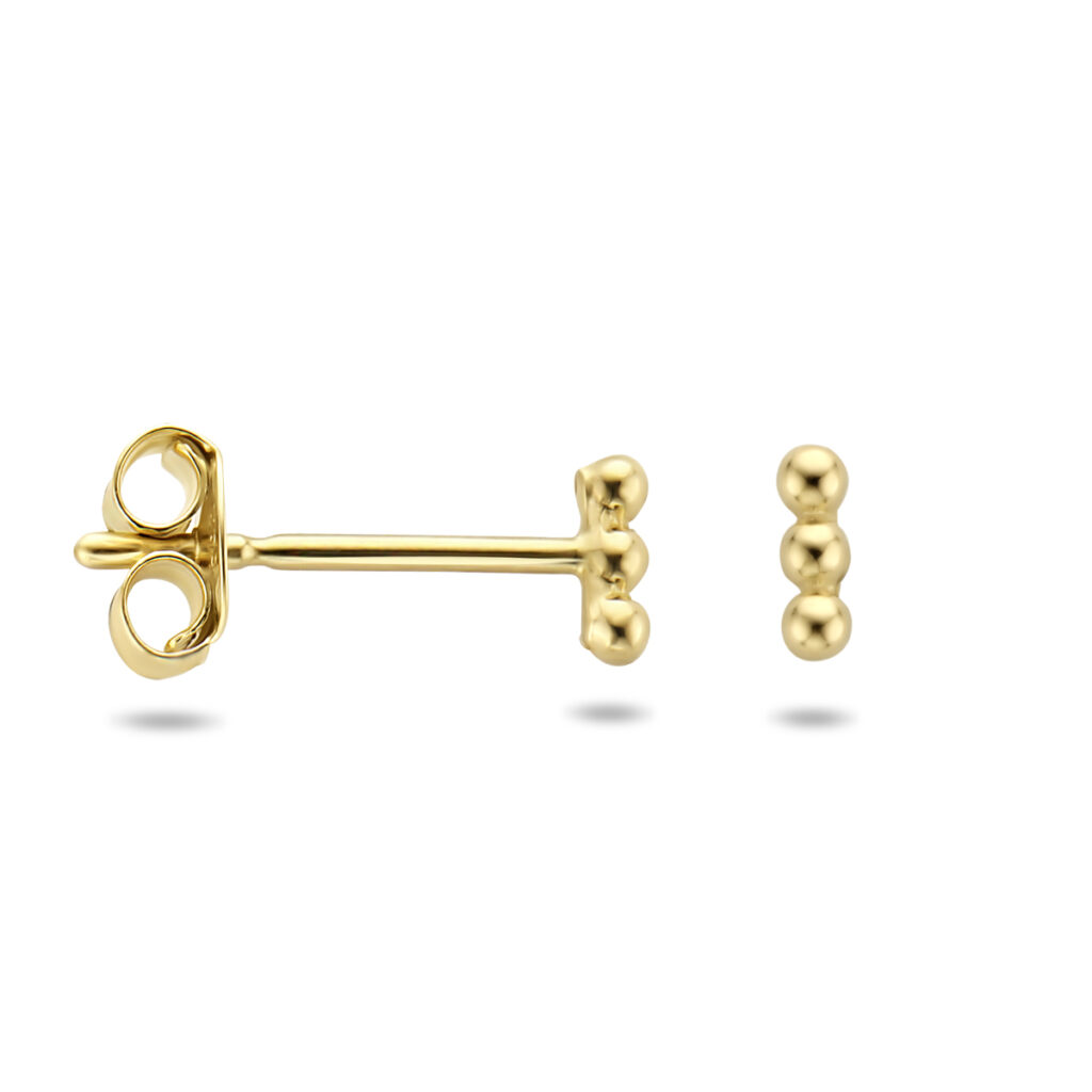 Geelgouden oorknoppen met 3 bolletjes met een totale afmeting van 4 bij 1.5 mm en uitgevoerd met een stevige poussette sluiting.