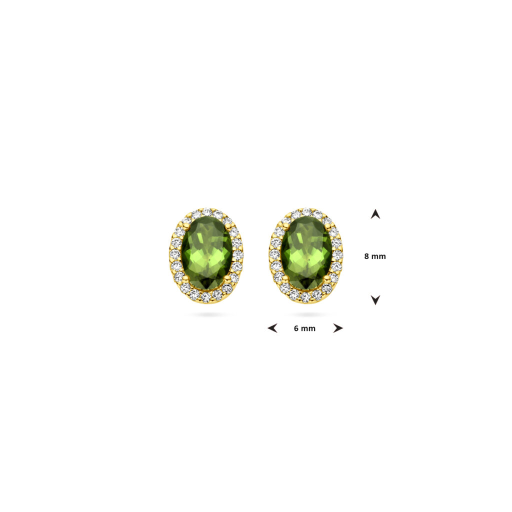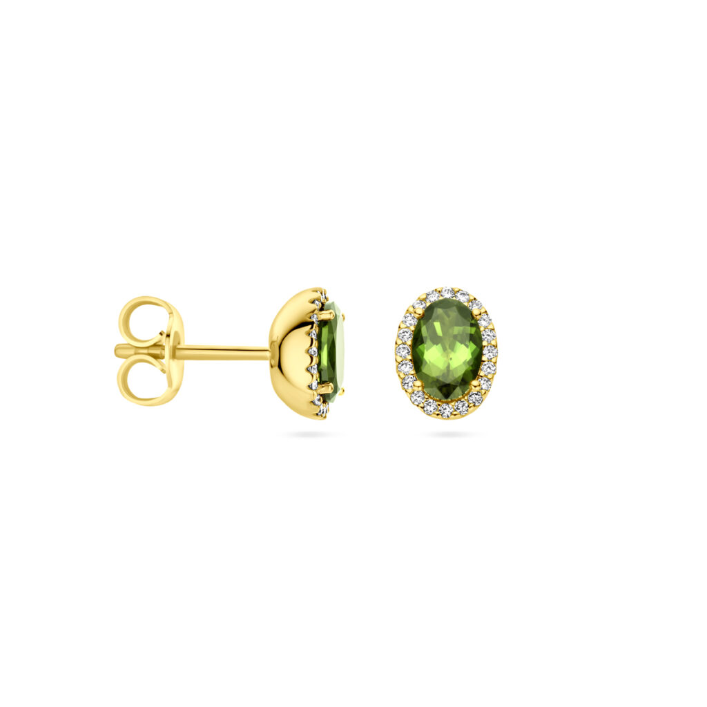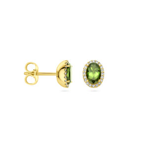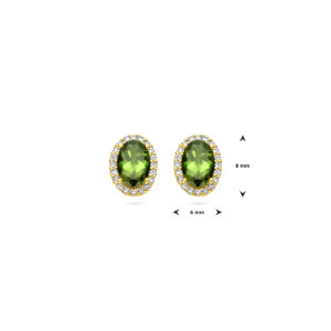 14k Geelgouden oorknoppen uitgevoerd met groen toermalijn en diamant. De oorknoppen hebben een afmeting van 8x6mm.