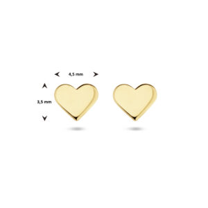 14k Geelgouden oorknoppen uitgevoerd in de vorm van een hart. De oorknoppen hebben een afmeting van 3.5×4.5mm.