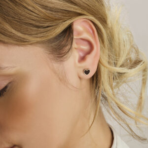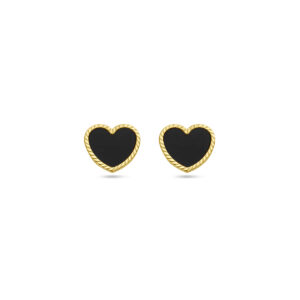 14k Geelgoud oorknoppen uitgevoerd in de vorm van een hart met onyx. De oorknoppen hebben een afmeting van 7.5×8.5mm.