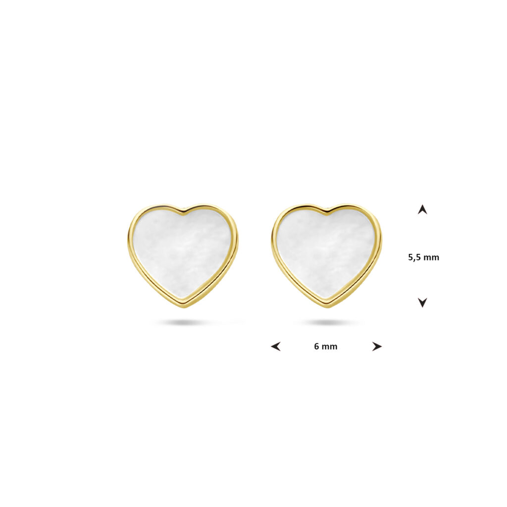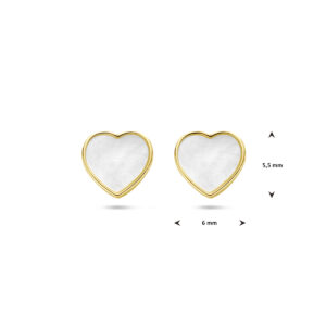 14k Geelgouden oorknoppen in de vorm van een hart uitgevoerd met parelmoer. De oorknoppen hebben een afmeting van 5.5x6mm.