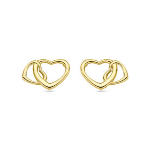 14k Geelgouden oorknoppen uitgevoerd met twee hartjes. De oorknoppen hebben een afmeting van 9x6mm.