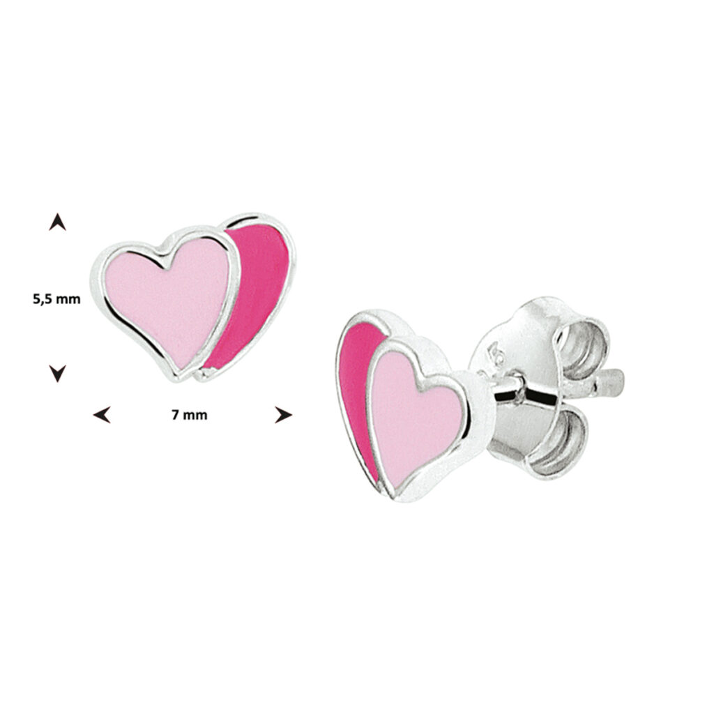Schattige gerhodineerd zilveren hartjes oorknoppen met een afmeting van 5.5x7mm. Uitgevoerd met roze emaille en een stevige poussette sluiting. Deze oorknoppen zijn perfect te combineren met bijpassende sieraden uit onze collectie. Tip: Leuk om kado te geven! Info: Gerhodineerd zilver is door de rhodiumlaag beter bestand tegen verkleuren en krassen.