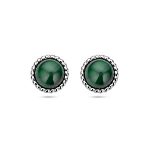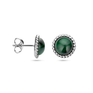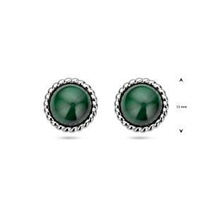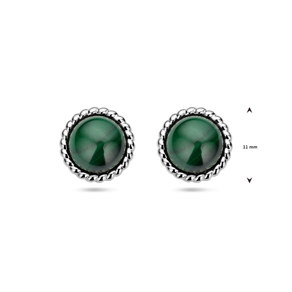 Gerhodineerd 925 zilveren oorknoppen uitgevoerd met malachiet. De oorknoppen hebben een diameter van 11mm.