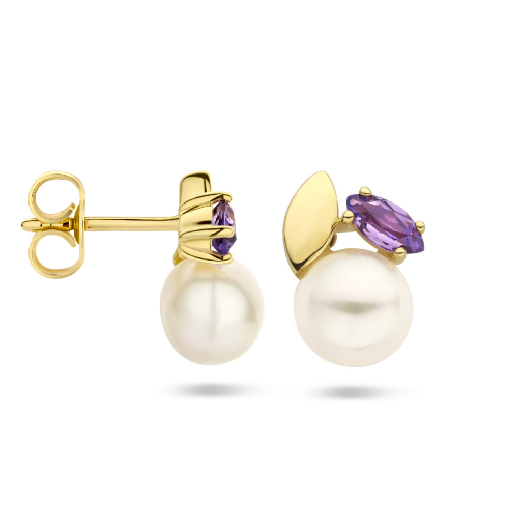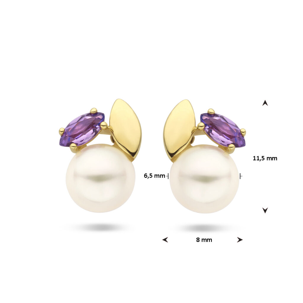 14k Geelgouden oorknoppen uitgevoerd met een zoetwaterparel en amethist. De oorknoppen hebben een afmeting van 11.5x8mm.