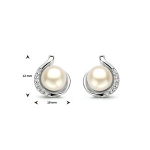 Gerhodineerd zilveren oorknoppen met zirkonia en zoetwaterparel. De oorknoppen zijn onderdeel van een set.