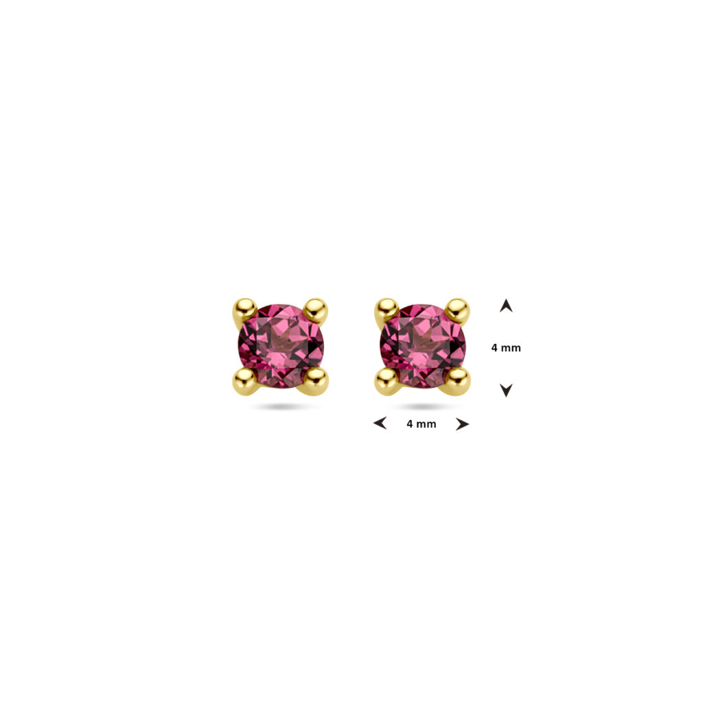 14k Geelgouden oorknoppen uitgevoerd met roze rhodoliet. De steen heeft een diameter van 4mm.