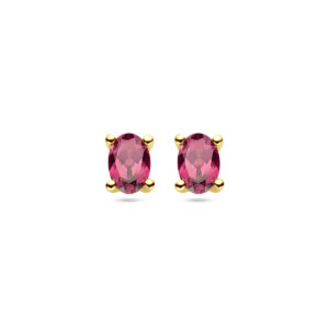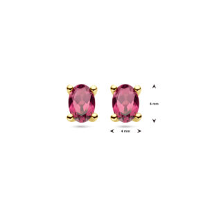 14k Geelgouden oorknoppen uitgevoerd met roze rhodoliet. De steen heeft een afmeting van 6x4mm.