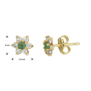 Deze Geelgouden Diamanten Rozet Oorknoppen met Groene Smaragd zijn volledig gemaakt van 14 karaats geelgoud, de allerbeste kwaliteit geelgoud, met een gepolijst oppervlak en meerdere diamanten en een groene smaragd. Deze oorknoppen hebben een breedte van 5,4mm met een hoogte van 6mm. Dit sieraad bestaat uit een geelgouden zeshoekig stervormig plaatje met langs de rand zes kleurloze diamanten die mooi glinsteren, met in het midden een groene smaragd. Aan de achterkant zit een slanke steker met een handige sluiting, waarmee u deze oorknoppen gemakkelijk in- en uitdoet. Deze oorknoppen zijn geschikt voor dames en zijn bijzonder leuk als cadeau. Dit sieraad zal tevens niet misstaan op bijvoorbeeld een luxe gala of een black-tie event. Deze oorknoppen behoren tot onze huiscollectie, waardoor u verzekerd bent van de allerbeste kwaliteit tegen de scherpste prijs!