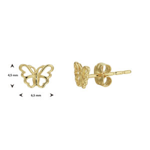 Deze Opengewerkte Vlinder Oorknoppen van Gepolijst Geelgoud zijn volledig gemaakt van 14 karaats geelgoud, de allerbeste kwaliteit geelgoud, met een gepolijst oppervlak. Deze oorknoppen hebben een breedte van 6,5mm met een hoogte van 4,5mm. Dit sieraad bestaat uit een vlindervormig plaatje met opengewerkte vleugels, met aan de achterkant een slanke steker en een handige sluiting, waarmee u deze oorknoppen gemakkelijk in- en uitdoet. Deze oorsieraden zijn geschikt voor dames en zijn bijzonder leuk als cadeau. Dit sieraad zal tevens niet misstaan op bijvoorbeeld een luxe gala of een black-tie event. Deze oorsieraden behoren tot onze huiscollectie, waardoor u verzekerd bent van de allerbeste kwaliteit tegen de scherpste prijs!