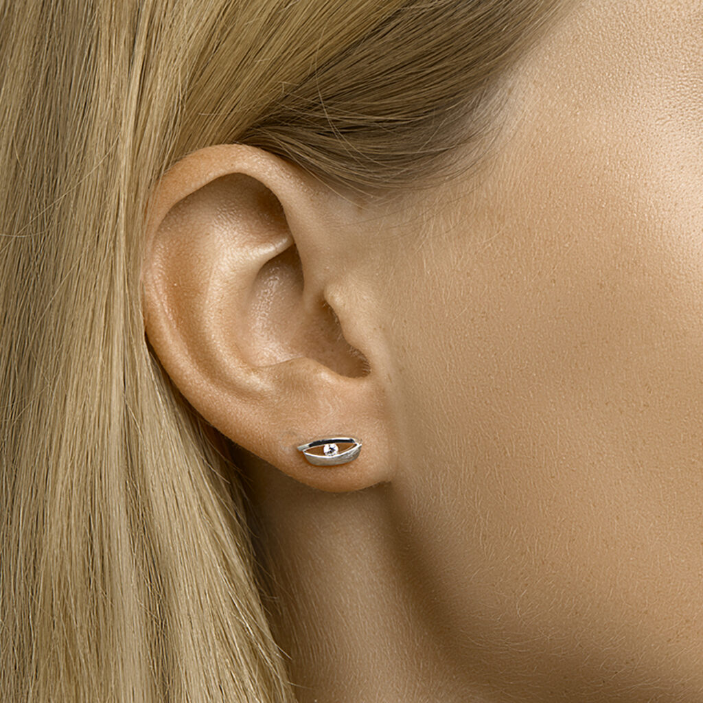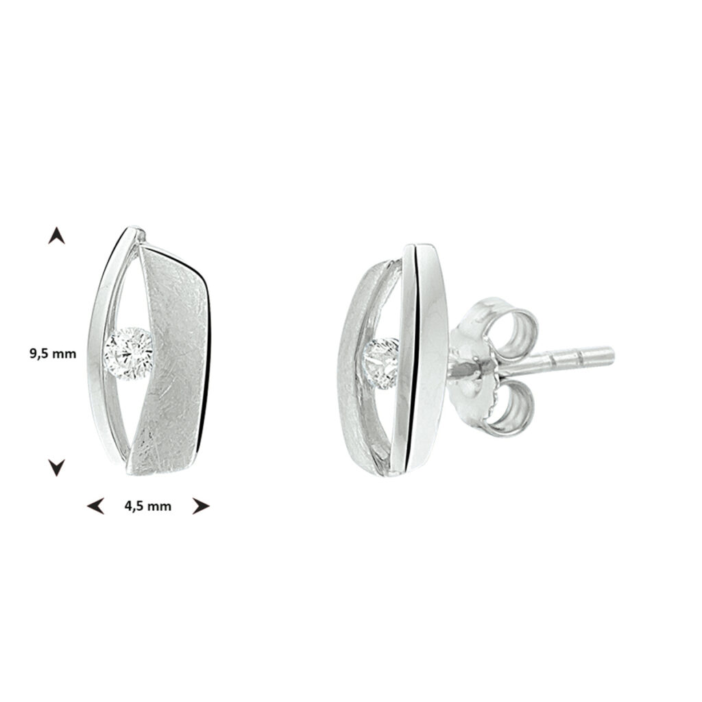 Gerhodineerd 925 zilveren oorknoppen uitgevoerd met een heldere zirkonia en een poli/matte afwerking. De oorknoppen hebben een afmeting van 9.5×4.5mm.