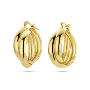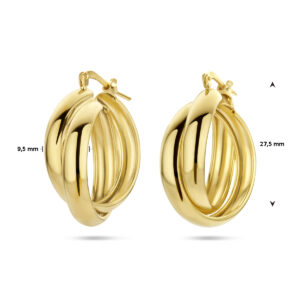 Deze Goudkleurige Dubbele Oorringen zijn vervaardigd uit 925 Sterling zilver, dat is voorzien van een geelgoudkleurige coating van 1 micron. De oorringen hebben een metaalgewicht van circa 6,33 gram en zijn uitgevoerd in de vorm van 2 om elkaar vallende ringen, waarbij de oorsteker in het midden van de beide ringen is geplaatst. Deze oorringen hebben een hoogte van 27,5 mm bij een breedte van 9,5 mm. De oorringen zijn tevens verkrijgbaar in zilver.