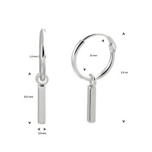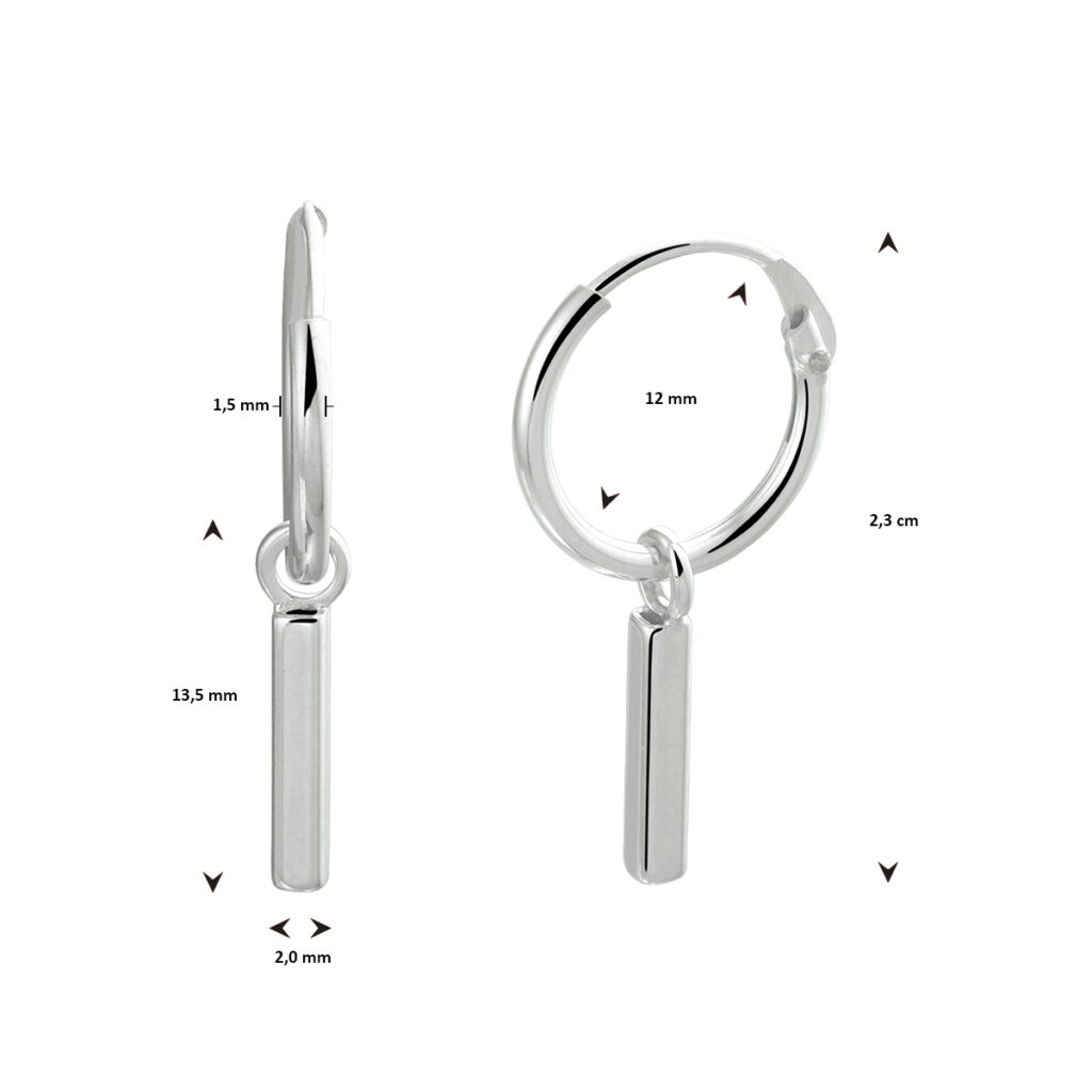 Gerhodineerd 925 zilveren oorringen uitgevoerd met een hanger in de vorm van een balkje. De oorringen hebben een dikte van 1.5mm en een diameter van 12mm. Het balkje heeft een afmeting van 13.5x2mm.