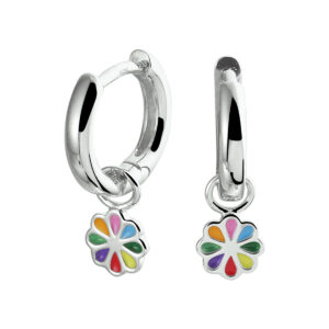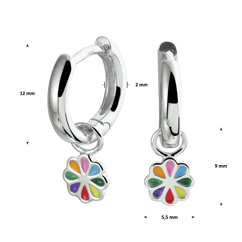 Schattige gerhodineerd zilveren oorringen uitgevoerd met een bloem in verschillende kleuren emaille. De oorringen hebben een diameter van 12.5mm.