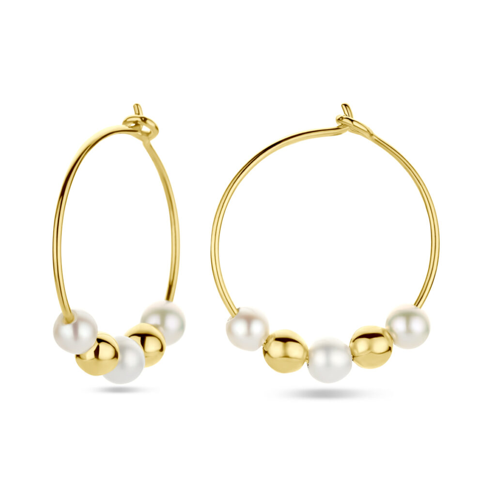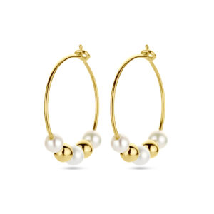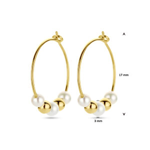 14k Geelgouden oorringen uitgevoerd met bolletjes en zoetwaterparels. De oorringen hebben een afmeting van 17×0.5mm. De parel heeft een een diameter van 3mm.