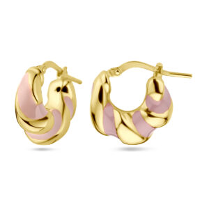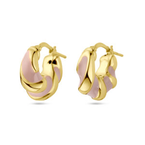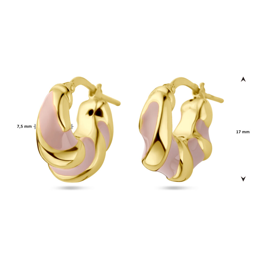Geelgoud op 925 zilveren oorringen uitgevoerd met roze emaille. De oorringen hebben een afmeting van 17×7.5mm.