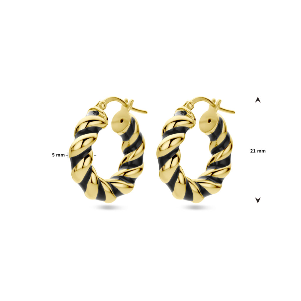 Geelgoud op 925 zilveren oorringen uitgevoerd met zwart emaille. De oorringen hebben een breedte van 5mm.