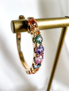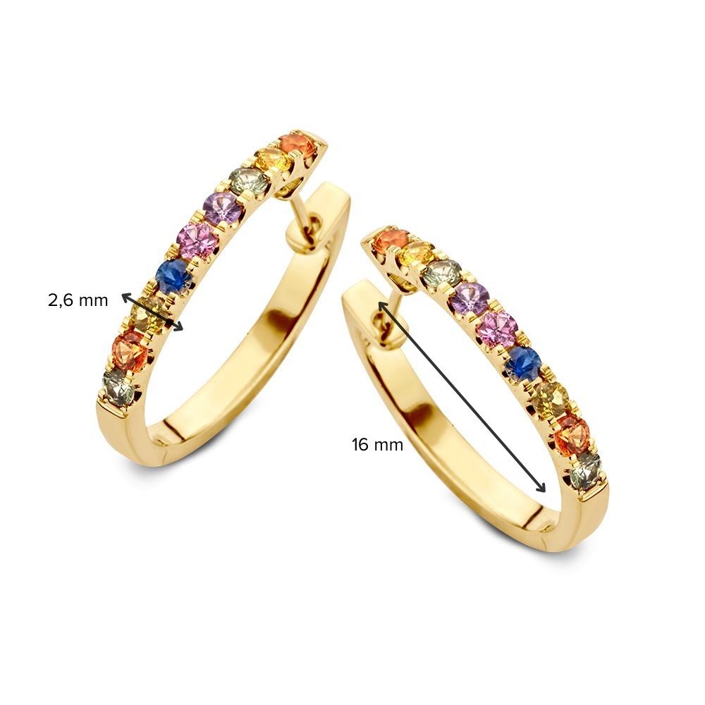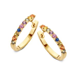Deze oorringen zijn afkomstig van het merk Excellent Jewelry dat alweer 25 jaar een toonaangevende Nederlandse sieradenleverancier en vaste partner van vele Nederlandse juweliershuizen is. De oorringen zijn gemaakt van 14 karaats geelgoud, de allerbeste kwaliteit goud, met een fijntjes gepolijst oppervlak dat mooi glanst. Deze oorringen bestaan uit een slanke strook geelgoud met een scharnier en een slanke steker die u gemakkelijk door uw oor steekt, met aan de voorkant meerdere rainbow saffier edelstenen die mooi glinsteren en die voor een glinsterend geheel zorgen. Deze oorringen hebben een gewicht van 5,8 gram met een lengte van 16mm en een breedte van 2,6mm.